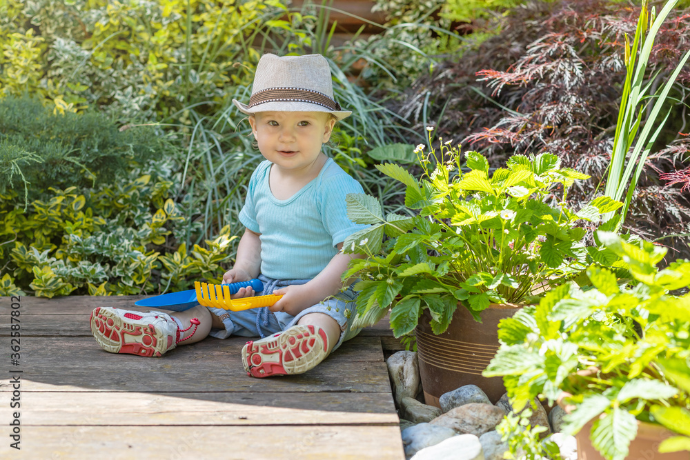 Cute little baby boy is playing with baby rake and scoop sitting in the garden