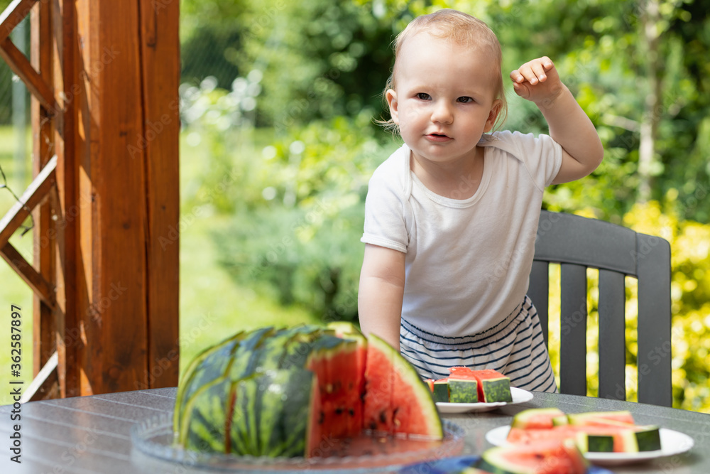 Cute baby boy is posing with his hand raised and looking at the camera. Watermelon is lying on the table.