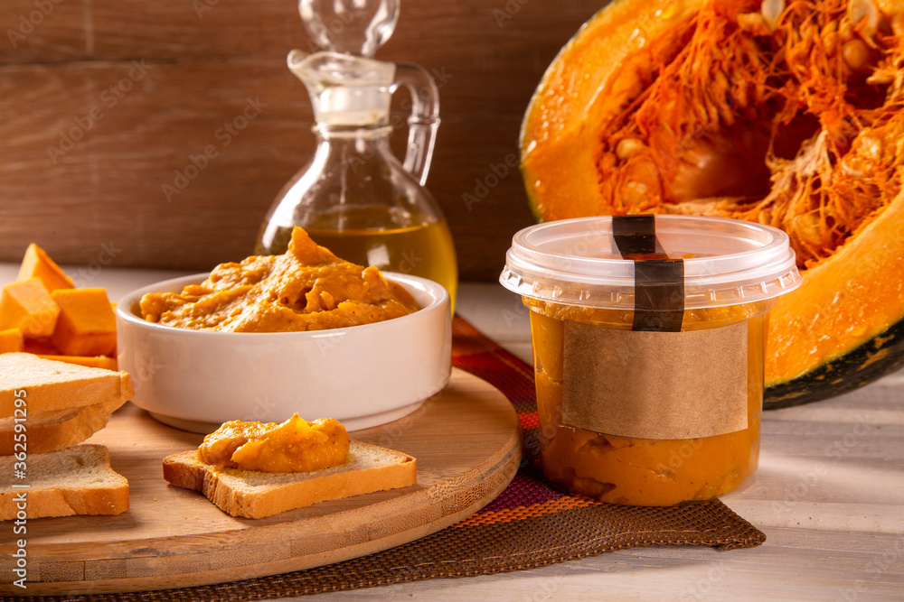 Pumpkin puree or hummus on a rustic wooden table. Selective focus