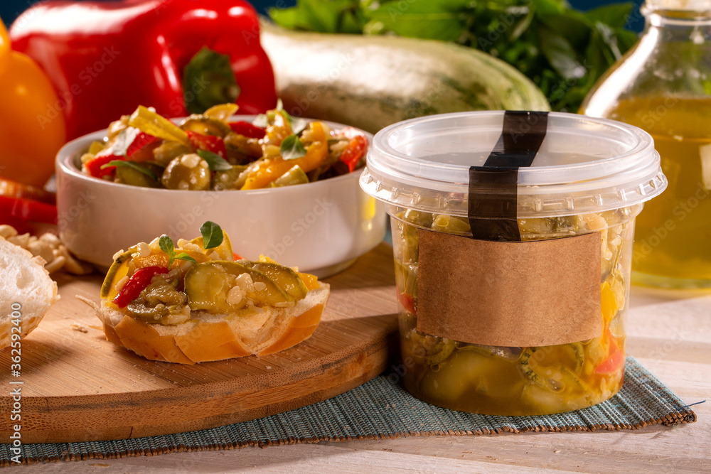 Cooking of zucchini salad with vegetables , tomatoes, pepper, olive and vegetable oil
