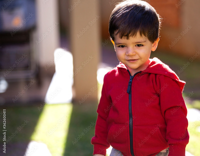 Closeup portrait of cute adorable Caucasian smiling baby boy, wearing red sport hoodie shirt. One year and six months child looking in camera