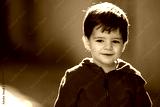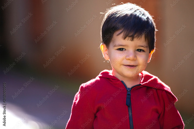 Closeup portrait of cute adorable Caucasian smiling baby boy, wearing red sport hoodie shirt. One year and six months child looking in camera