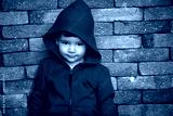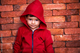 Closeup portrait of serious and expressive Brazilian baby, wearing red sport hoodie shirt. A year and six months child looking on camera.