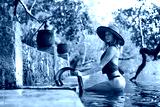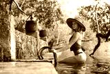 beautiful blonde woman in summer hat and aquamarine swimsuit posing near nature laguna in Mexico in summertime at green forest background