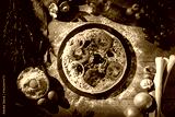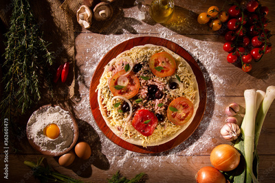 Various vegetables at wooden rustic background with copyspace on round pizza desk. Set of fresh vegetables. Egg, tomatoes, pepper, lettuce, onion, garlic, onion. Pizza ingredients.