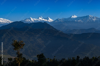 Beautiful landscape of Himalayan snow mountains from Chaukori, Uttarakhand, India