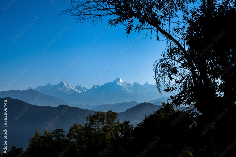 Beautiful landscape of Himalayan snow mountains from Chaukori, Uttarakhand, India