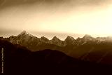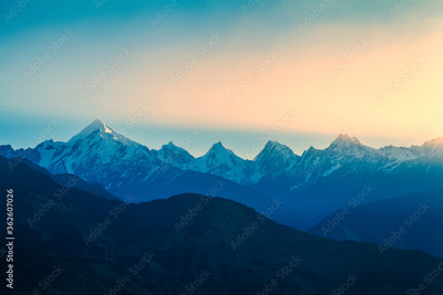 Beautiful Panchchuli peaks of the Great Himalayas as seen from Munsiyari, Uttarakhand, India.