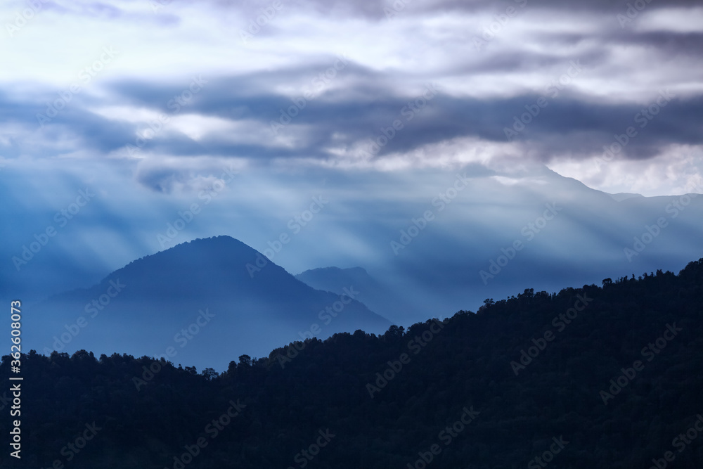 View of beautiful Panchchuli Peaks of the Great Himalayas as seen from Munsiyari, Uttarakhand, India.