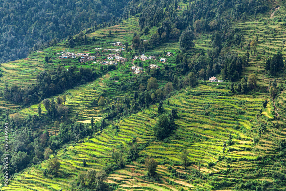 Highland agricultural fields of wheat in the Himalayas, Uttarakhand, India.