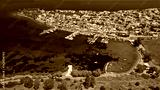 Aerial drone photo of picturesque fishing village of Perdika next to iconic small island of Moni, Aigina island, Saronic gulf, Greece