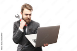 bearded man in suit worker for fix problem computers