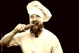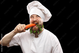 Funny caucasian bearded man chef gnaws carrots and green leaves appear from his beard isolated on black background