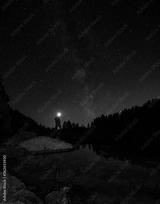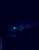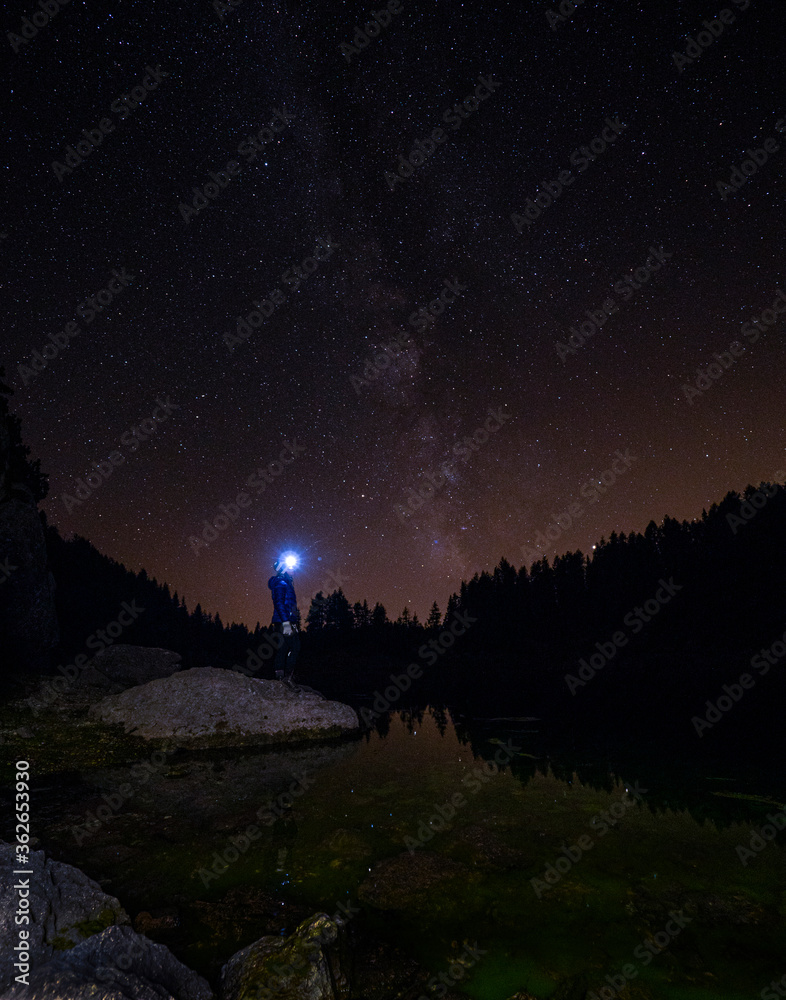 Female hiker wearing a headlamp stands on rock and observes the starry night sky