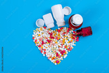 Medical pills and tablets spilling out of a drug bottle on blue background