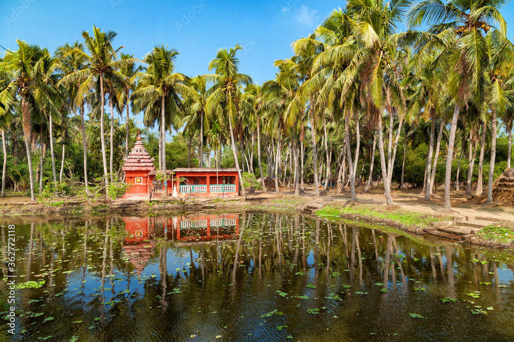 Reflection of hindu temple and palm trees at odisha, india.