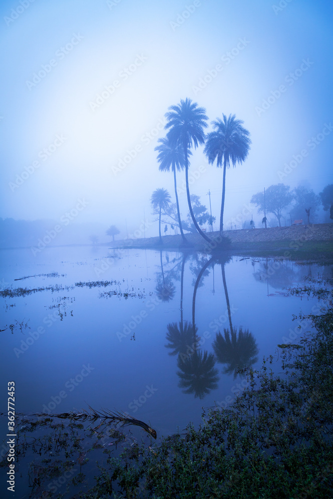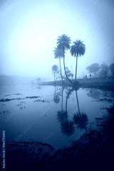 Morning on the lake early morning reeds mist fog and water surface on the lake, Pachmarhi, Madhya pradesh, India.