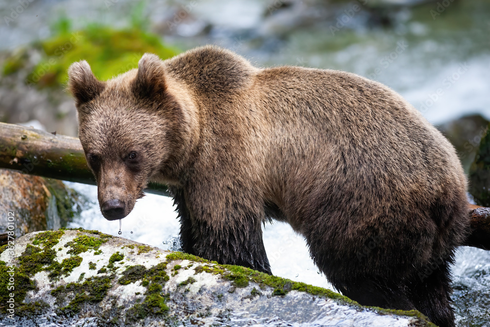 Majestic brown bear, ursus arctos, standing on the rock in river. Curious mammal staring on rock from side. Wild animal standing on mossy stone in woodland with water stream in background.