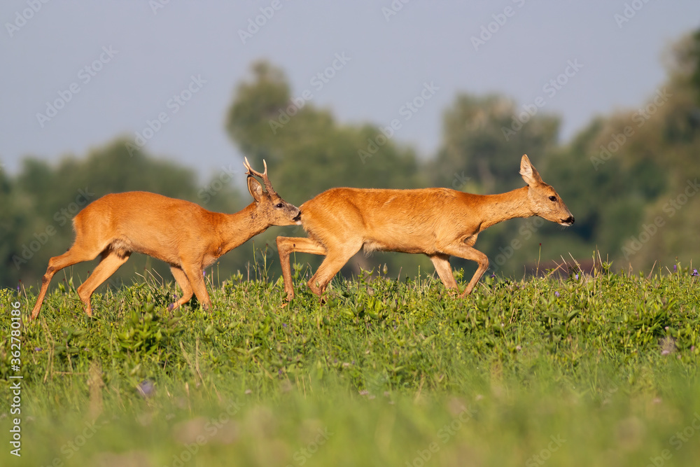 Roe deer, capreolus capreolus, male sniffing female on meadow during the summer. Pair of mammals walking on sunshine. Roebuck chasing doe on field in mating season.