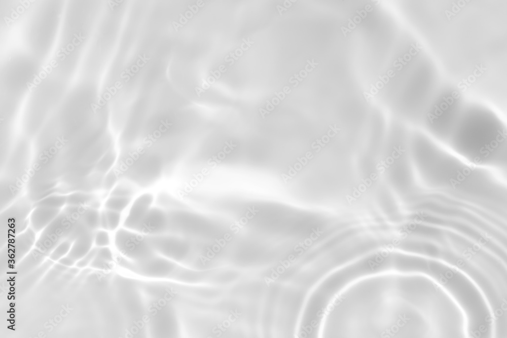 Closeup of desaturated transparent clear calm water surface texture with splashes and bubbles. Trendy abstract nature background