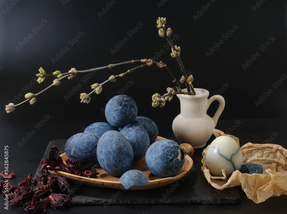 Few painted chicken eggs on wooden plate, dried red petals, peeled egg on crumpled paper and tree branch in little ceramic bowl on black shale plate on dark background