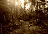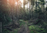 Forest road under Tall spruce-trees, slope of the hill covered by orange earth under overcast sky. Fir forest with high trees in Carpathian mountains, Europe. Travel background