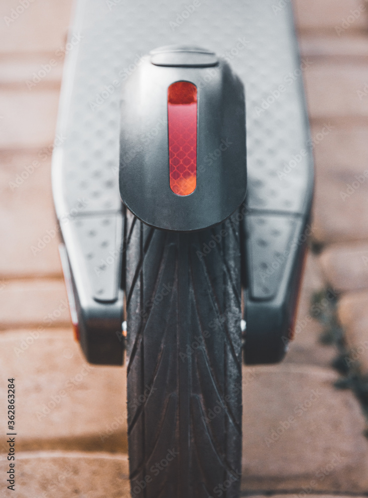 Close-up of electric scooter wheel and light reflector.
