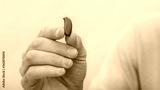 BTE hearing aid close-up in a male hand. Hearing solution, man holds a hearing aid, macro