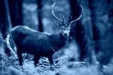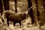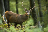 Interested red deer, cervus elaphus, stag standing in green woodland from side view and looking into camera. Curious wild animal grazing in wilderness with trees.