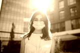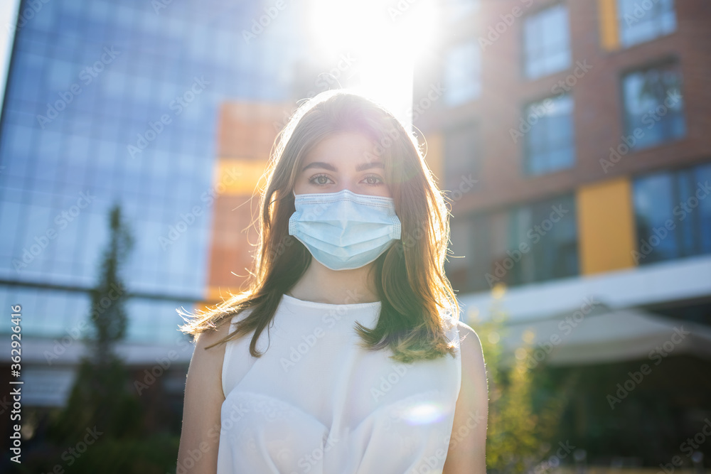 young woman in elegant formal suit and medical mask standing on city street near modern office buildings and looking at camera in sunny summer day