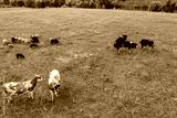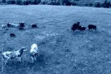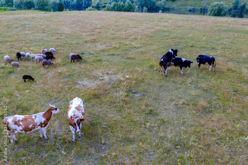A herd of cows and sheep on a summer pasture. Mating cows in nature. Shooting from a drone.
