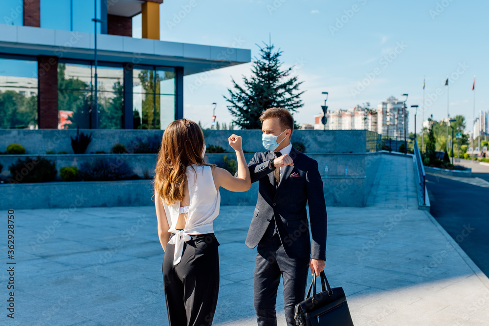 Side view of cheerful young man and woman in formal wear and medical masks greeting each other with gestures while having meeting on city street during coronavirus pandemic