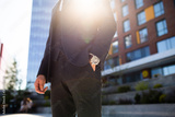 Close up of businessman in formal suit with hand in pocket, . Alone, space.