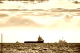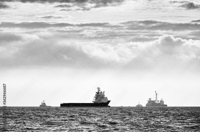 Black and white picture of ships silhouettes on the horizon at sunset.