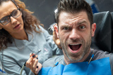 Attractive young woman in stomatology clinic with male dentist. Healthy teeth concept.