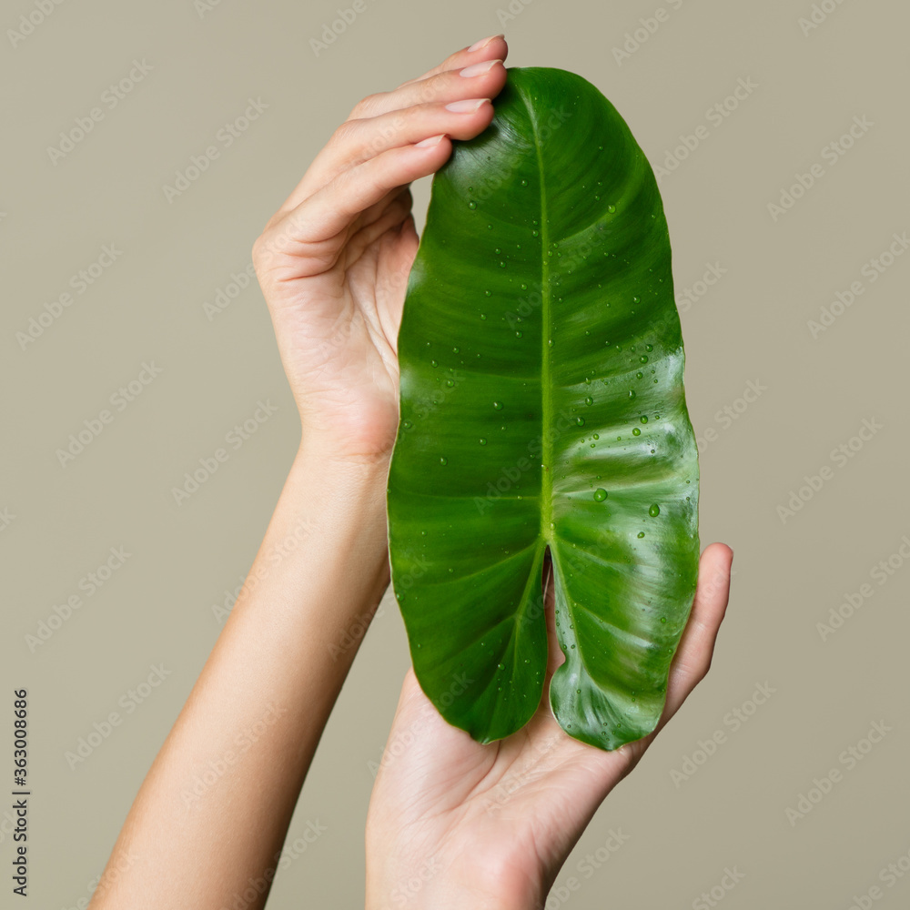 Beautiful female hands hold a green leaf. Cleanliness and care. Olive background.