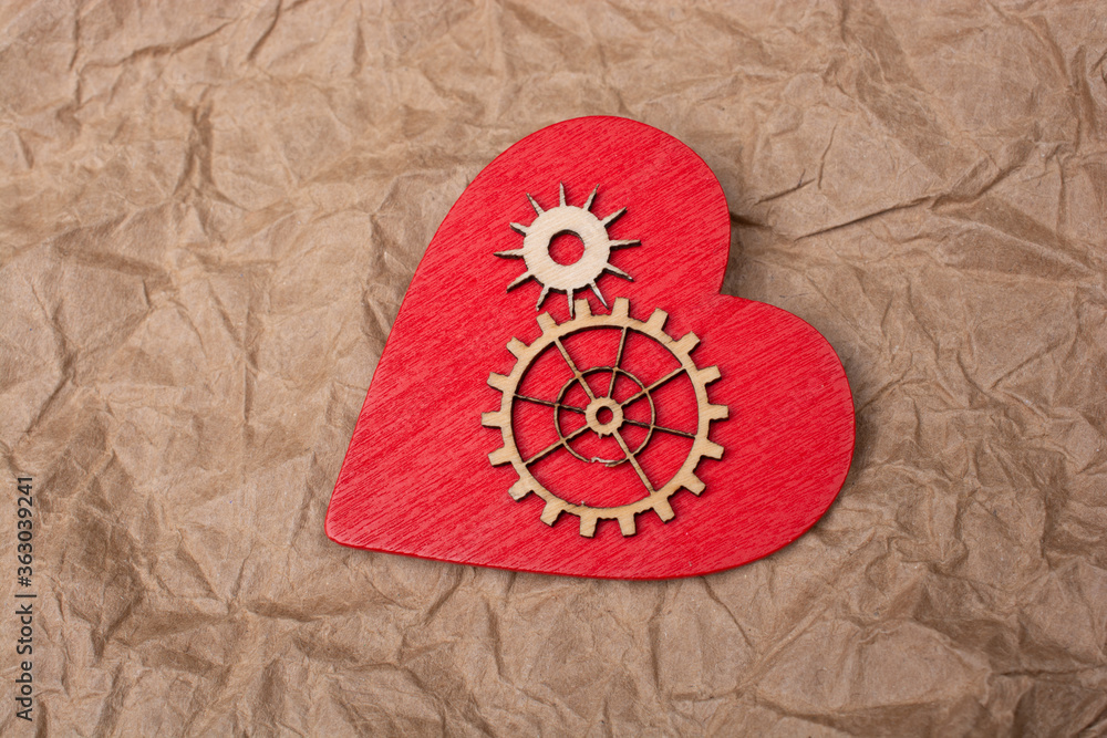 Gear wheels on red Heart shape. Valentine concept and promise of love.