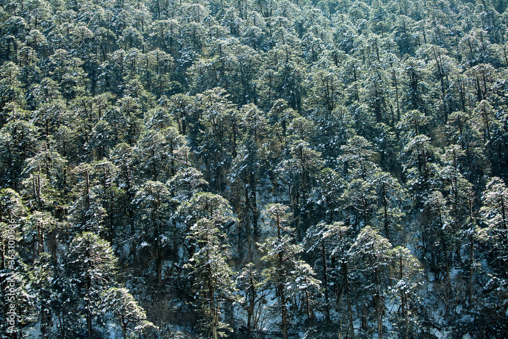 Forest of green pine trees on mountainside at Yumthang valley, sikkim, india