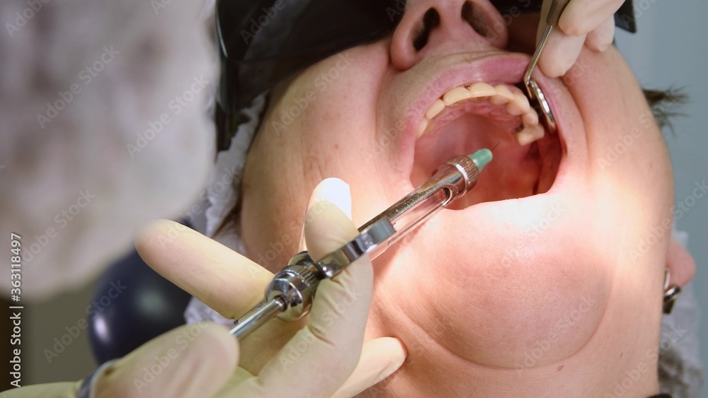 Dentist making local anaesthesia shot before surgery. Senior woman at dental clinic. Dentist with assistant install implant in a patient mouth in modern dental office