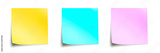 Set of three pastel colored sticky notes isolated on panoramic white background