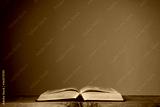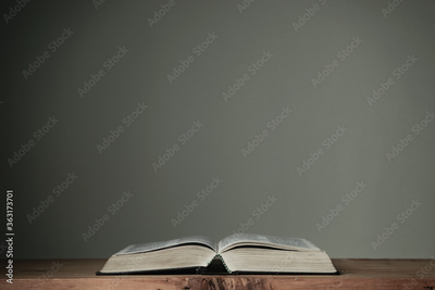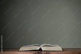 Open Holy Bible on a red wooden table and white wall background. Religion concept.