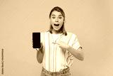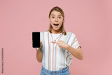 Shocked young blonde woman girl in casual striped shirt isolated on pastel pink background. People lifestyle concept. Mock up copy space. Pointing index finger on mobile phone with blank empty screen.