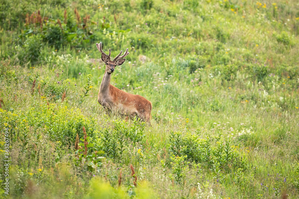 Young red deer, cervus elaphus, stag with antlers in velvet standing on meadow in the summer. Mammal in steep slope of mountains from side view.
