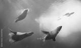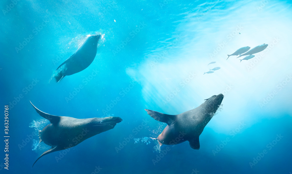 Seals hunting for fish. Ocean underwater with marine animals. Sun rays passing through the water surface.