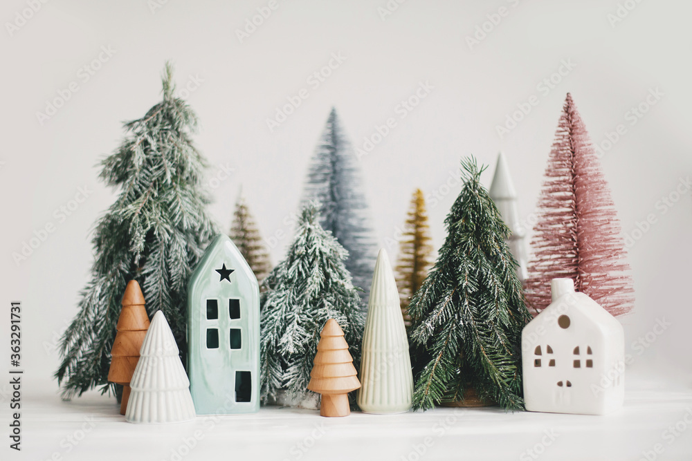 Christmas little houses and trees on white background. Festive modern decor. Happy holidays. Miniature cozy village, ceramic houses, wooden and handmade christmas trees. Space for text