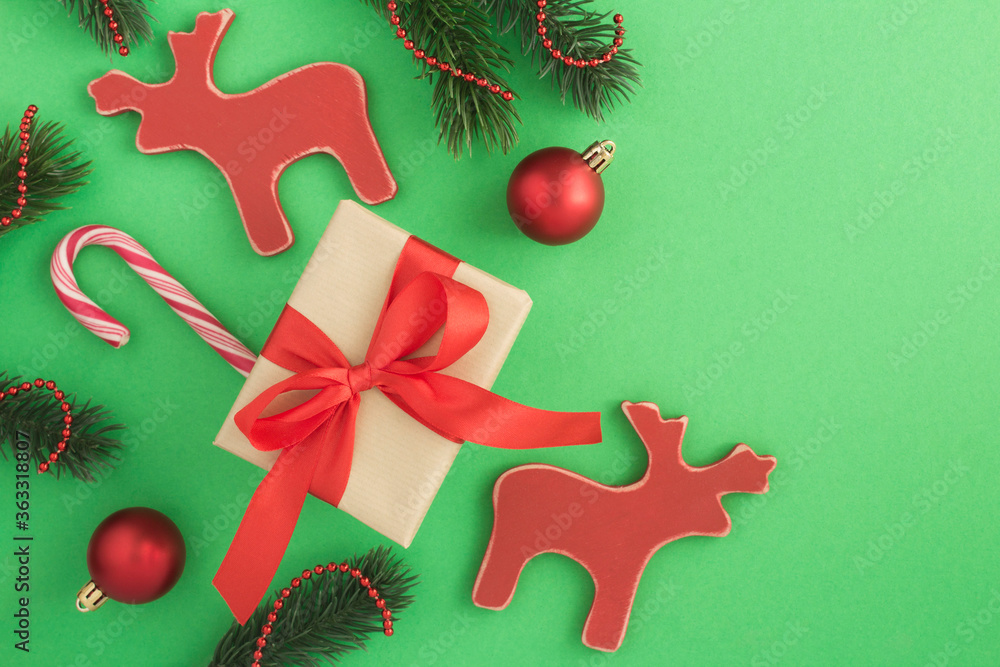 Christmas composition with a gift in the center of the green background. Top view. Copy space.