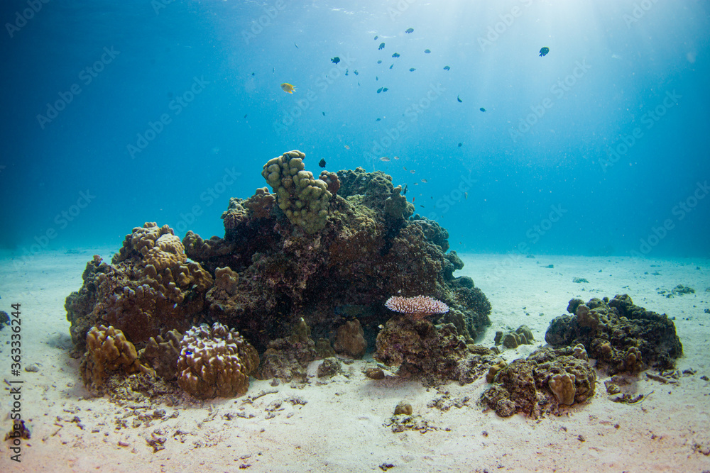 Wonderful and beautiful underwater in deep tropical sea and sun rays. Water texture in ocean with corals and tropical fish.