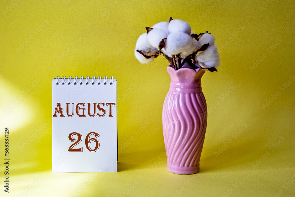 Calendar with text 26 august on yellow background and with a vase of flowers