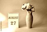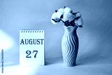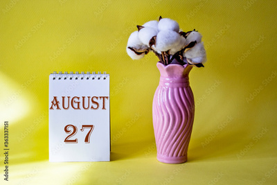 Calendar with text 27 august on yellow background and with a vase of flowers