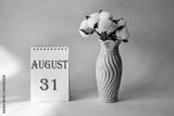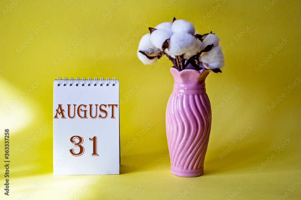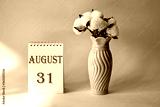 Calendar with text 31 august on yellow background and with a vase of flowers